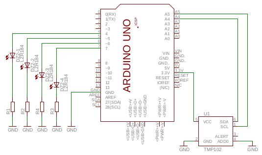 In the schema above the connection of the temperature sensor and LED's are presented. The resistors used have a value of 390 ohms.